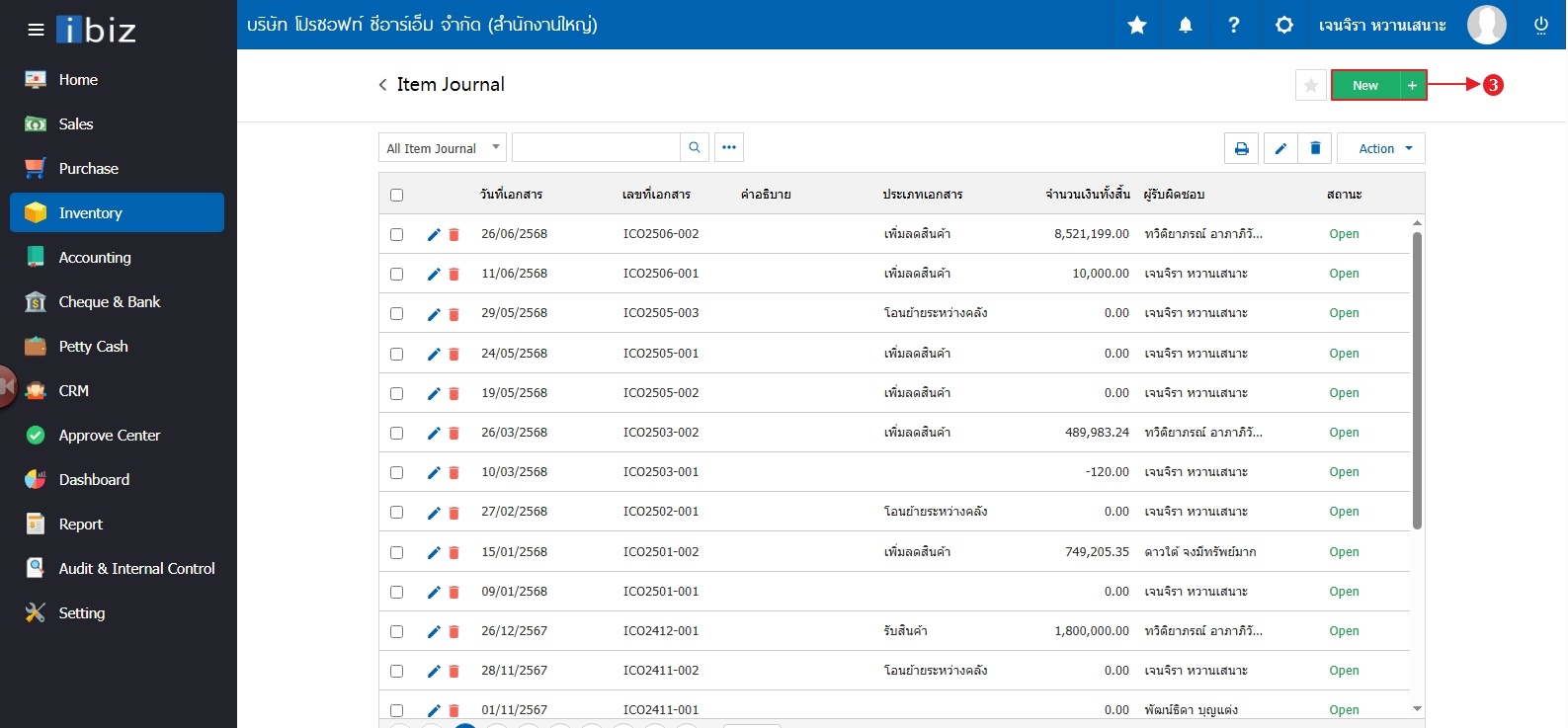 2. จากนั้นระบบจะแสดงหน้าจอรายการปรับปรุงเพิ่มลดสินค้า ผู้ใช้สามารถสร้างเอกสารปรับปรุงเพิ่มลดสินค้าใหม่ได้โดยกดปุ่ม “New” [หมายเลข 3] ทางด้านขวาบนของหน้าจอโปรแกรม ดังรูป
