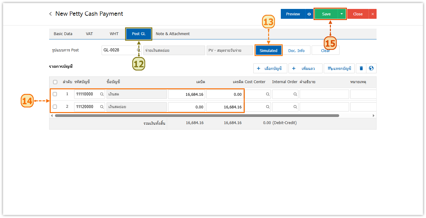 5. ให้ผู้ใช้ไปที่ Tab Post GL [12] ในการบันทึกข้อมูลรายการรายวัน ให้ผู้ใช้กดปุ่ม Simulated [13] ระบบจะแสดงข้อมูล เดบิต, เครดิต [14] ให้ผู้ใช้ทำการตรวจสอบข้อมูลทั้งหมดให้เรียบร้อย และกดปุ่ม Save [15] ทางด้านมุมขวาบนของหน้าจอเพื่อบันทึกข้อมูล