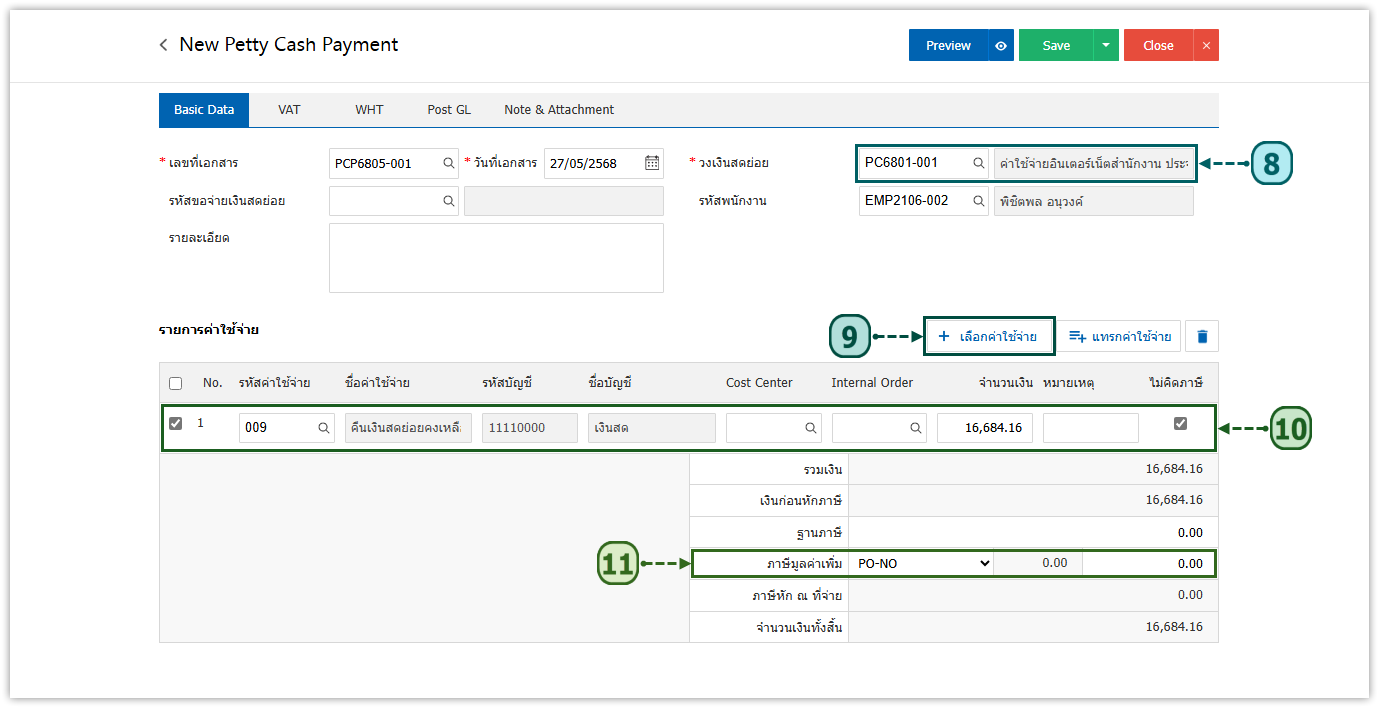 4. ให้ผู้ใช้กดปุ่ม New ทางด้านมุมขวาบนของหน้าจอ เพื่อสร้างเอกสาร “การปิดกองเงินสดย่อย” โดยให้ผู้ใช้เลือก วงเงินสดย่อย [8] ที่ต้องการปิดกองเงินสดย่อย และทำการ เลือกค่าใช้จ่าย [9] โดยรายการค่าใช้จ่ายที่เลือก จะต้องเป็นค่าใช้จ่ายที่สร้างไว้ตามข้อที่ [5] เมื่อรายการค่าใช้จ่ายเรียบร้อยแล้ว ให้ผู้ใช้ระบุ จำนวนเงินคงเหลือ [10] และในส่วนของภาษีมูลค่าเพิ่มให้เลือกเป็น ไม่คิดภาษี [11]