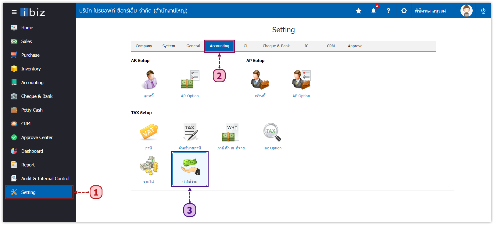 1. ให้ผู้ใช้สร้างรหัสค่าใช้จ่ายที่ใช้สำหรับ “การปิดกองเงินสดย่อย” โดยให้ผู้ใช้ไปที่ระบบ Setting [1] เลือก Tab Accounting [2] และกดเข้าไปในเมนู ค่าใช้จ่าย [3]