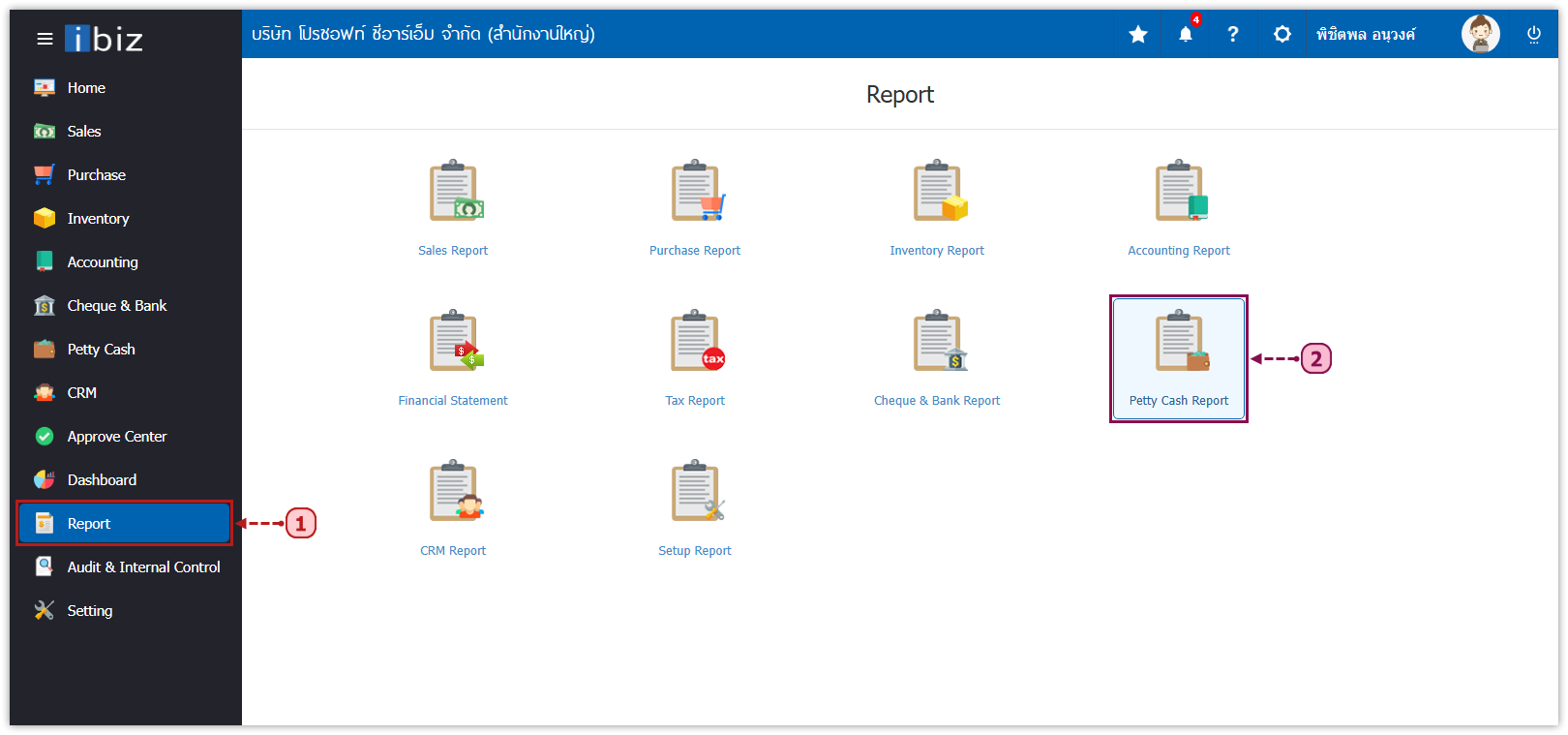 ให้ผู้ใช้ไปที่ระบบ Report [1] เลือก Petty Cash Report [2]