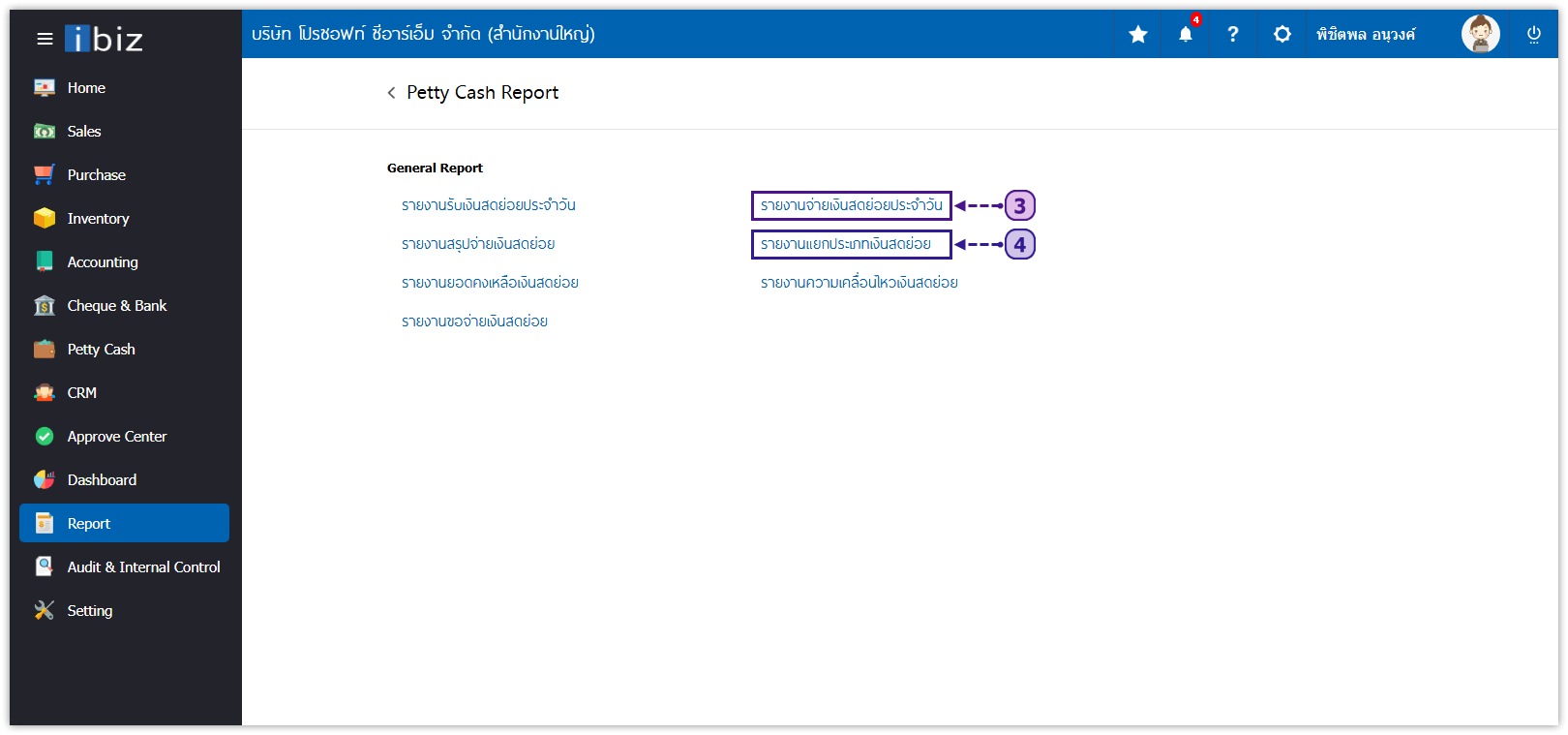 จะพบรายงานที่เกี่ยวข้องกับเงินสดย่อย (Petty Cash) ทั้งหมด ซึ่งรายงานเงินสดย่อยที่แสดงรายละเอียดค่าใช้จ่าย มีทั้งหมด 2 รายได้ ได้แก่ รายงานจ่ายเงินสดย่อยประจำวัน [3] และ รายงานแยกประเภทเงินสดย่อย [4]