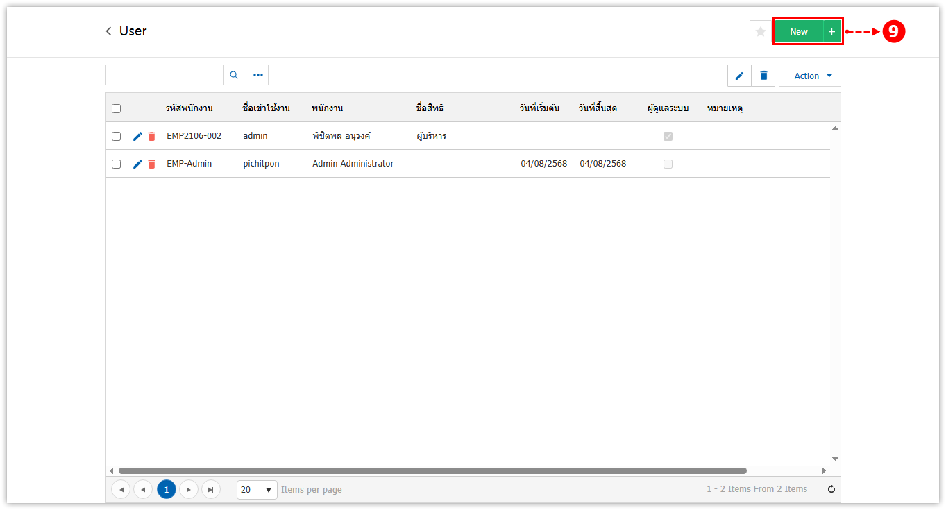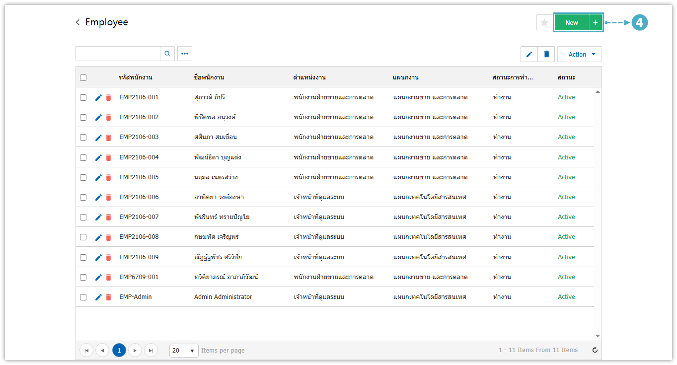 จากนั้นให้ผู้ใช้กดปุ่ม New [4] ทางด้านมุมขวาบนของหน้าจอ เป็นสร้างข้อมูลพนักงานใหม่ ดังรูป