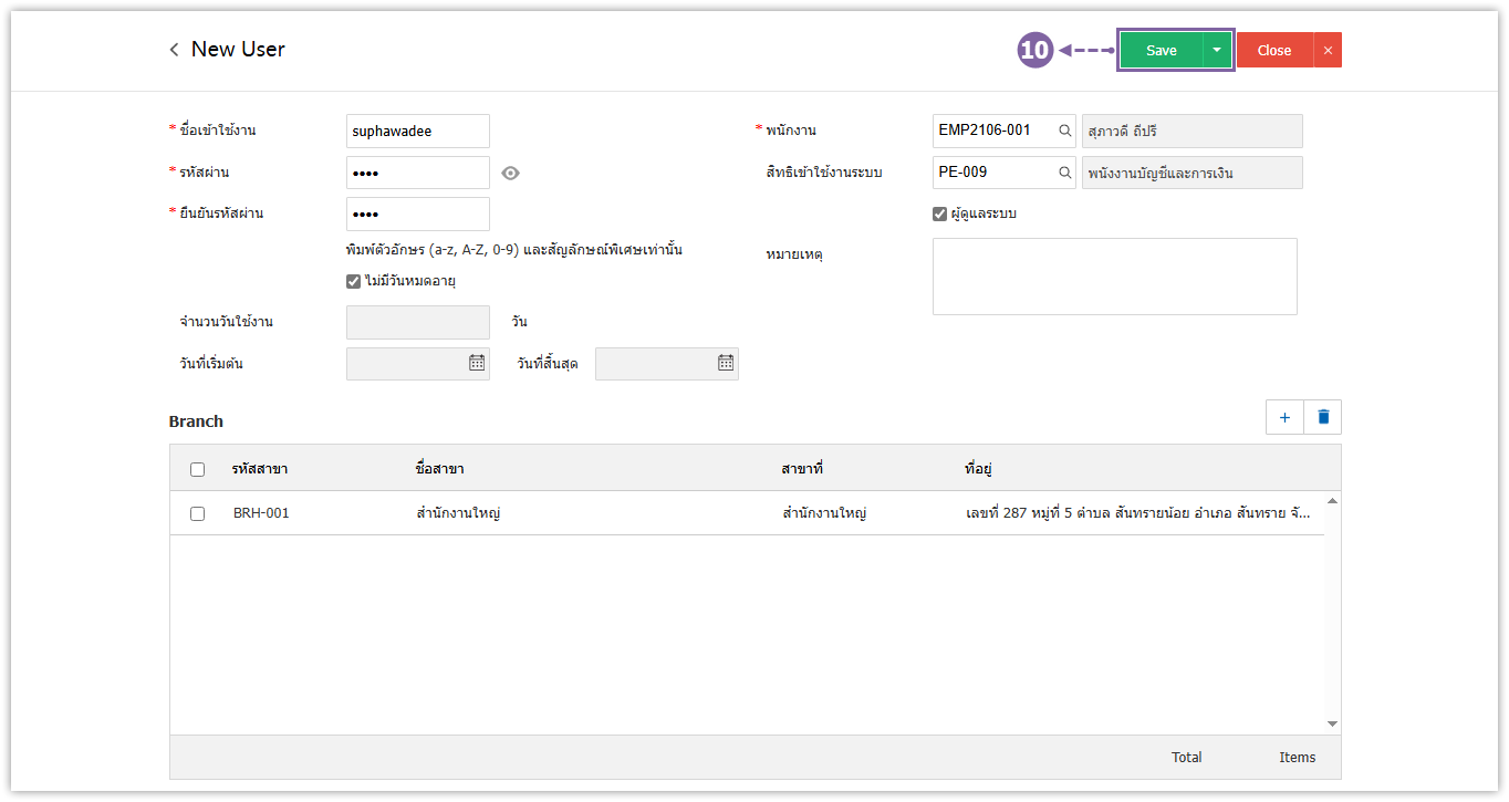 ให้ผู้ใช้กรอกข้อมูลผู้ใช้และรหัสผ่าน (Username & Password) ทั้งหมดให้เรียบร้อย สามารถอ่านรายละเอียดการกรอกข้อมูลผู้ใช้และรหัสผ่าน (Username & Password) (แบบละเอียด) ได้ที่นี้ คลิก! เมื่อกรอกข้อมูลเรียบร้อยแล้วให้กดปุ่ม Save [10] ทางด้านมุมขวาบนของหน้าจอเพื่อบันทึกข้อมูล ดังรูป