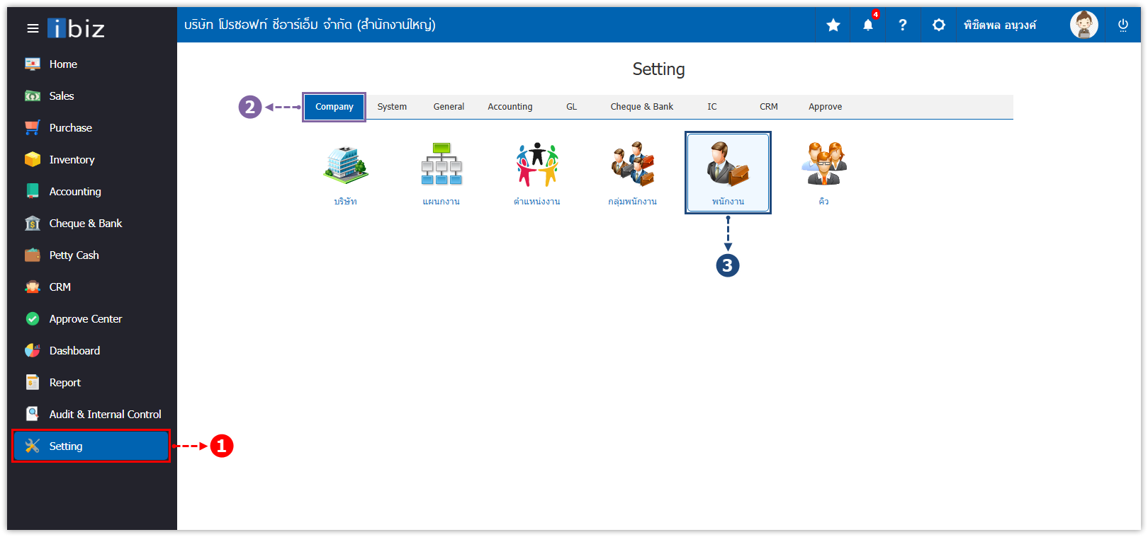 ให้ผู้ใช้ไปที่ระบบ Setting [1] เลือก Tab Company [2] กดปุ่ม เมนูพนักงาน [3] ดังรูป