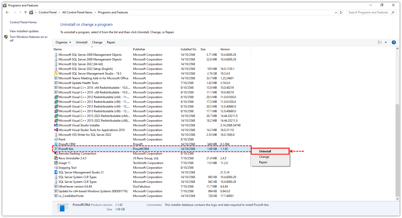 ขั้นตอนที่ 1 ให้ผู้ใช้ไปที่ Programs and Features เพื่อทำการถอน “โปรแกรมบัญชีออนไลน์ Prosoft ibiz” เพราะตัวโปรแกรมได้มีการเชื่อมต่อกับ Internet Information Services (IIS) Manager ที่มีปัญหาอยู่