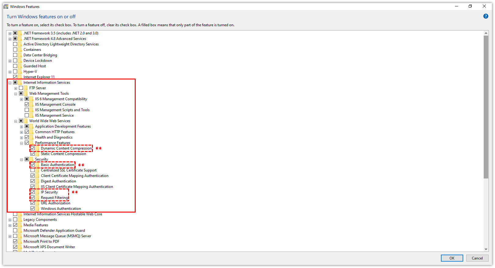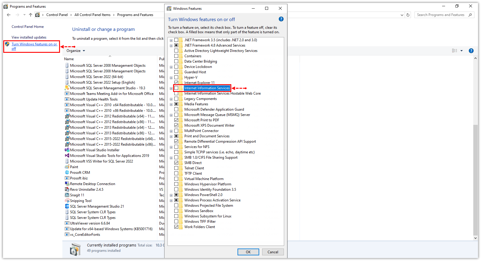 ขั้นตอนที่ 4 ให้ผู้ใช้ไปที่ Programs and Features ในส่วนของ Windows Features และทำการ “กดปุ่ม Checkbox” ในหัวข้อต่างๆ ของ “Internet Information Services” ตามรูปภาพตัวอย่าง