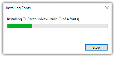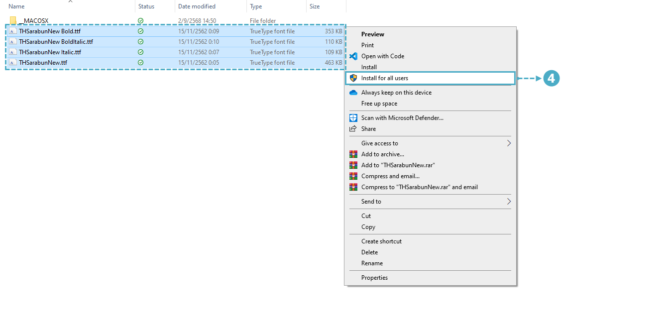 เมื่อทำการแตก File เรียบร้อยแล้ว จะพบว่า File Font ทั้งหมด 4 รายการ ให้ผู้ใช้ทำการคลุมดำทั้ง 4 รายการ กดปุ่ม Enter เพื่อติดตั้ง หรือทำการคลิกขวาเลือก Install For all users [4] ดังรูป