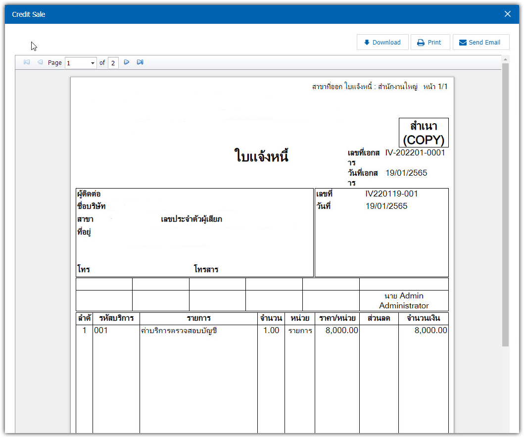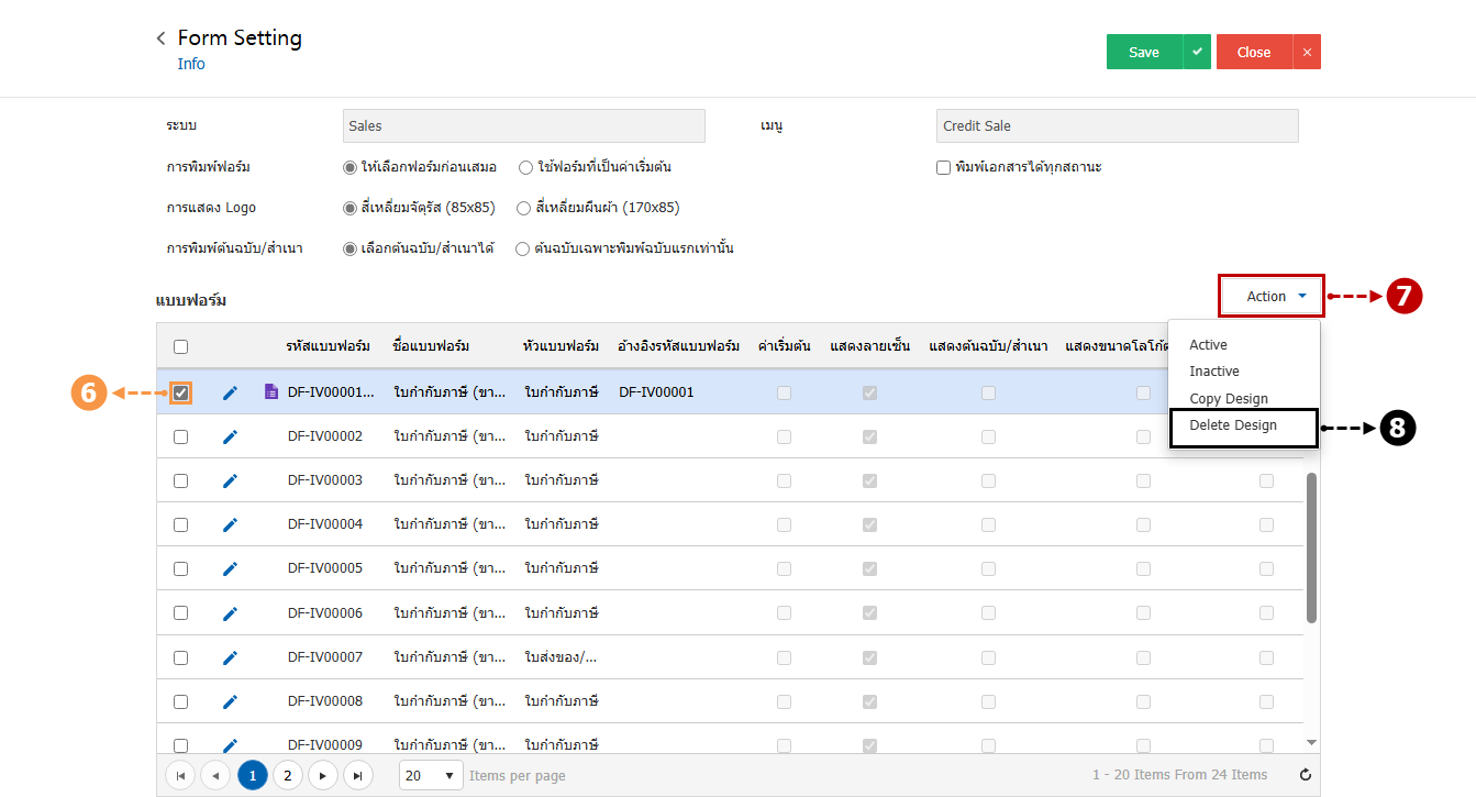 จากนั้นให้ผู้ใช้กลับไปที่เมนูตั้งค่าแบบฟอร์มและเลือกรายการ Copy Design Form [6] เดิมที่สร้างไว้ และกดปุ่ม Action [7] เลือก Delete Design [8] เพื่อลบแบบฟอร์มที่พบปัญหาตัวหนังสือ (Font) ใหญ่กว่าปกติ แล้วทำการสร้างแบบฟอร์มใหม่ ดังรูป
