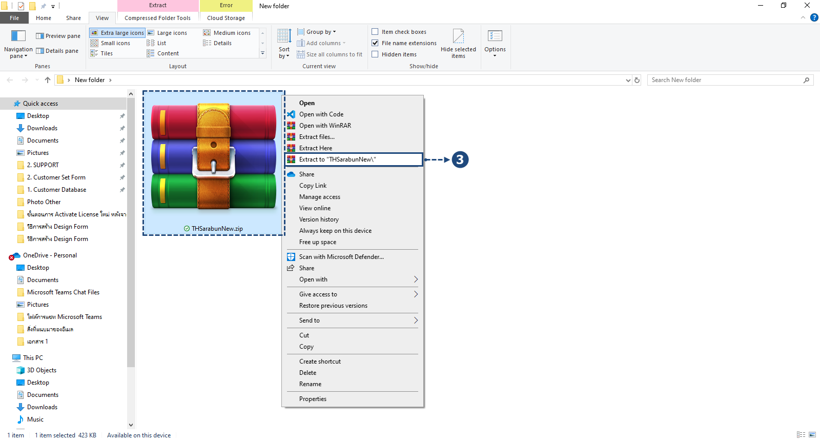 หลังจากที่ Dow nload เรียบร้อยแล้ว จะได้เป็น File Zip จากนั้นให้ทำการแตก File โดยคลิกขวาแล้วเลือก Extract to “THSarabunNew\” [3] ดังรูป