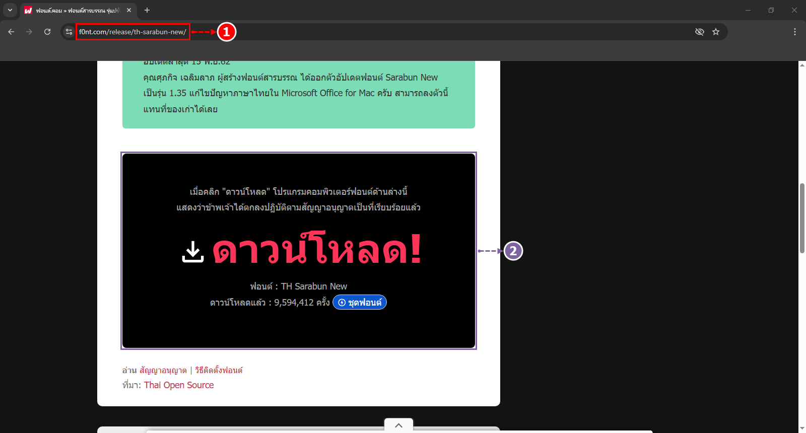 ผู้ใช้สามารถ Download Font : TH Sarabun New ได้ที่ www.f0nt.com/release/th-sarabun-new [1] และให้ทำการเลื่อนลงมาข้างล่างจะพบปุ่ม Download ให้ทำการกดปุ่ม ดาวน์โหลด [2] ดังรูป